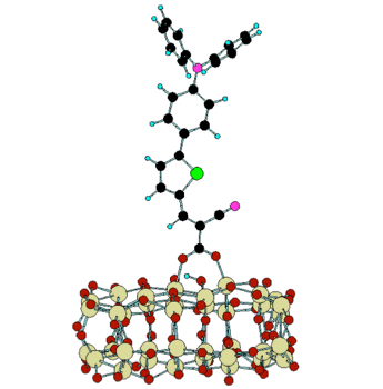Organic dye-titania nanoparticle complex for dye-sensitized solar cell.